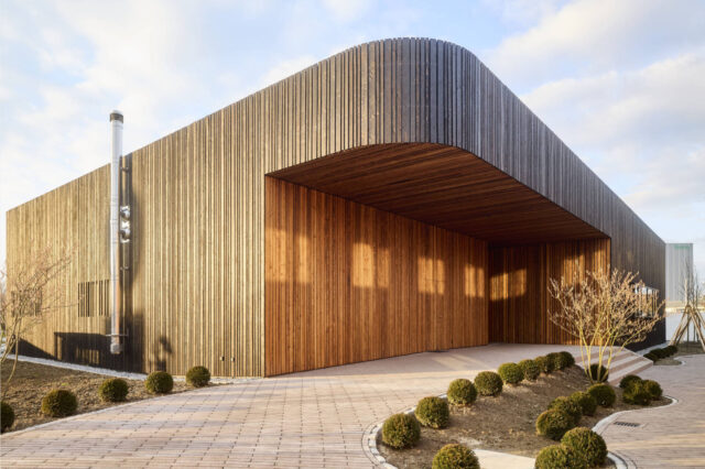 SAR Knext Neubau KNEXT-Showrooms mit Mitarbeiterverpflegung Ausführung 2024 Extravagante-organische Bauform, Fassaden- und Dachschalung aus Lärche Flamewood (traditionelle Methode des Holzschutzes ohne chemische Zusätze) Holzständerbauweise Außen- und Innenwände, Dach inkl. Dachschalung, Fassadenverkleidung Außenbereich Gewerblicher Bau