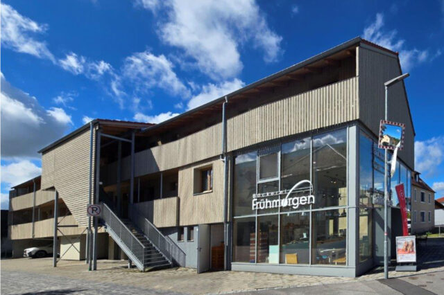 Schloss Wörth Neubau Wohn- und Geschäftsgebäude Ausführung 2021 Ansprechendes, nachhaltiges Wohn- und Geschäftsgebäude Bau aus massivem Kreuzlagenholz, Fassadenverkleidung Außenbereich Gewerblicher Bau